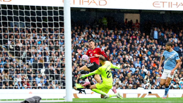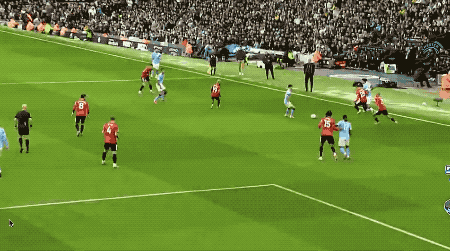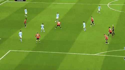 1分钟后,曼城率先获得进球,多库狂放过掉卢克肖,第二次传中转机为助攻,福登头槌破门。
