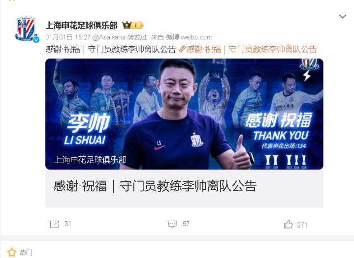 如今他离开上海申花,有东谈主普天同庆,觉得他终于走了,上海申花有救了,翌日几年上海申花可以年年夺冠,但是不可否定,他为上海申花付出好多,这十年莫得功劳,也有苦劳,他培养三位国字号门将,就凭这份功劳,也可以说前无古东谈主,后无来者,他欠上海申花球迷道喜,莫得他,可能上海申花只可处在保级行列,致使在中甲混,说不定球队也曾收场,恰是这样,上海申花球迷更应该感谢他,你们可爱李帅吗?你们还会崇敬他吗?你们会为他说声抱歉吗?