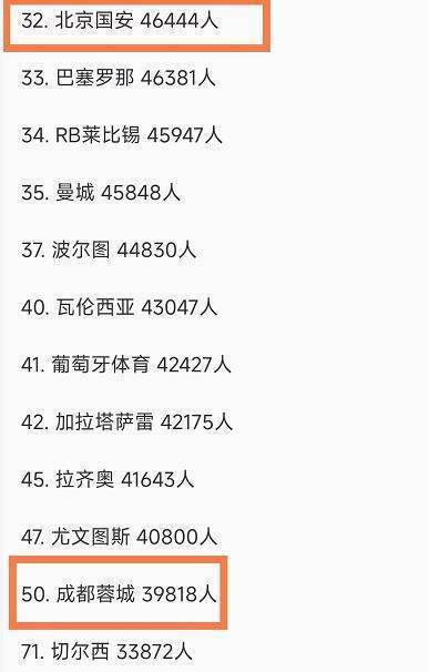 猜猜这前三甲是谁?领先,第又名细目是场均进步4万6千东说念主的北京国安了,排辞宇宙第32位,比巴萨、曼城、尤文图斯这些朱门王人要高,,它亦然亚洲上座东说念主数第又名,新工体如实相配火爆,本年的北京国安比赛长久一票难求,这亦然这支王人门球队的底蕴场地!