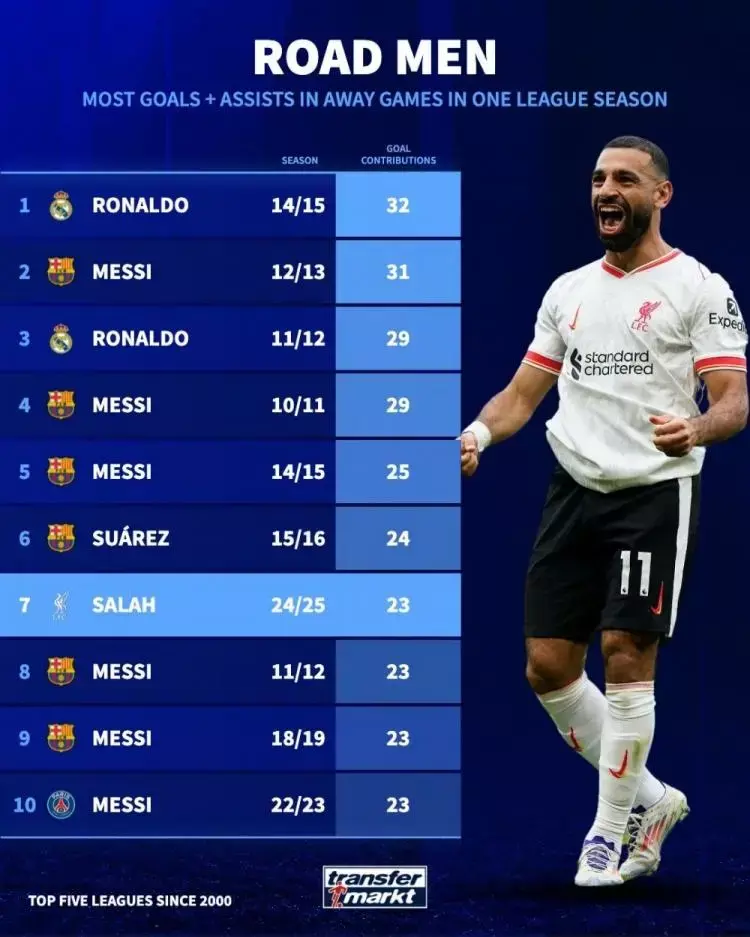 据统计,本赛季于今,萨拉赫在英超赛场整个照旧制造了23粒进球,排在21世纪五大联赛单赛季联赛客场制造进球榜的第7位,该榜单具体情况如下: