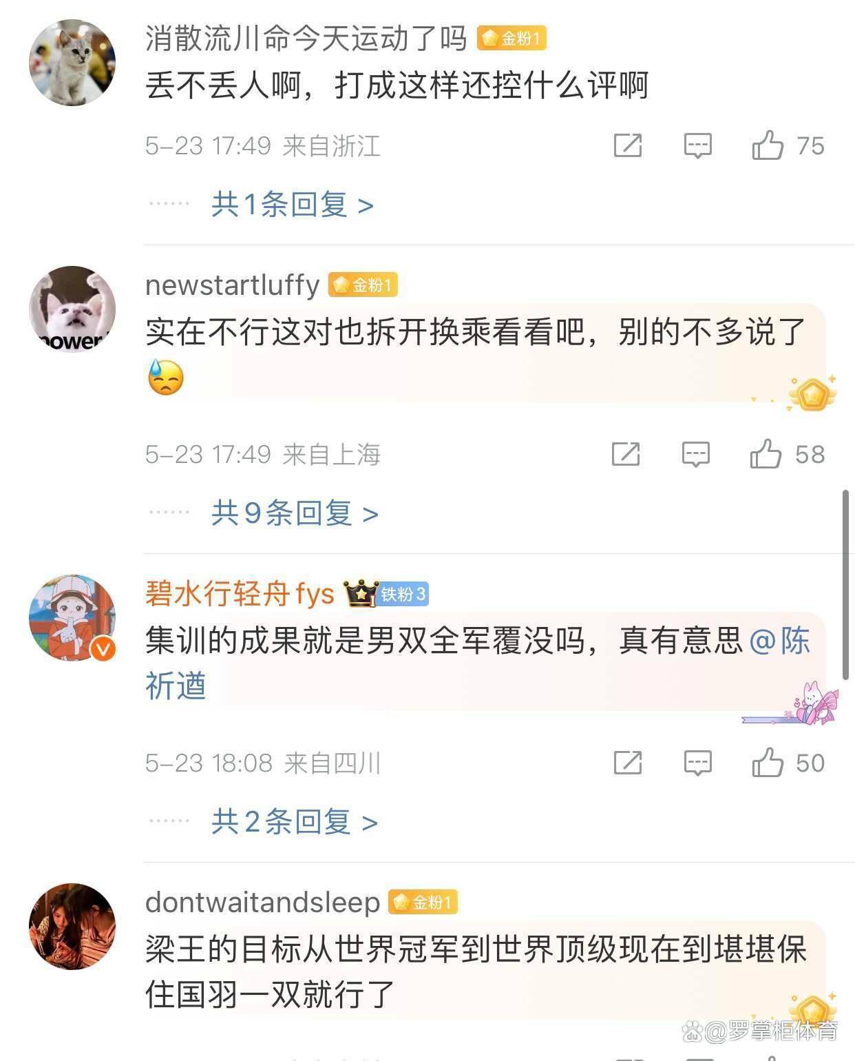 关于男双再次早早出局的恶果,网友纷纷抒发起火。有东说念主吐槽:“顽固集训即是这?练了些什么?”“羽毛球比赛无理大全!”“他们的见地从天下冠军到天下顶级,再到如今唯一保住国羽一对就行!”“多花些本领和心念念磋议怎么打球吧,少上点综艺!”还有不少球迷暗示,两东说念主似乎有些不念念超过,提倡阐明组将其拆对。