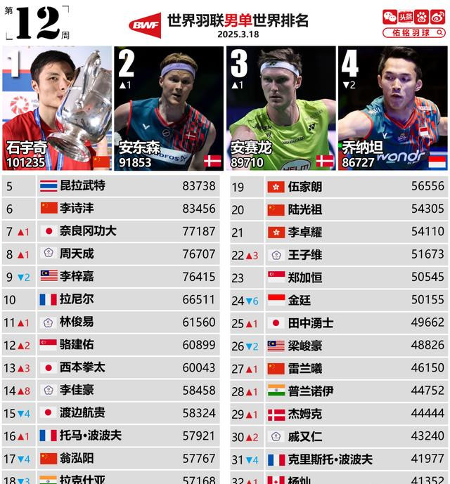 男单,石宇奇凭借全英赛冠军,积分重回10万+,陆续稳坐天下第一。卫冕冠军乔纳坦早早出局,排行下滑两位,跌至第4。排行高潮幅度最大的中国台北的黑马选手李佳豪,飙升8位,来到第14。如若一直保合手这么的景色,预想在8月世锦赛之前可以插足到前10。