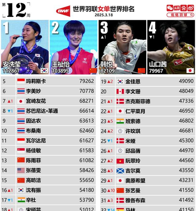 女单,排行变化幅度不大,山口茜手脚客岁的全英亚军,本年留步4强,排行被韩悦卓著,下滑至第4。卫冕冠军马林仍莫得复出,在扣除全英积分之后,排行暴跌至32,只剩下5项比赛的积分和。不外马林和戴资颖不同样,莫得肯求排行保护,戴资颖是客岁全英的四强选手,如今排行仍是跌出前32。